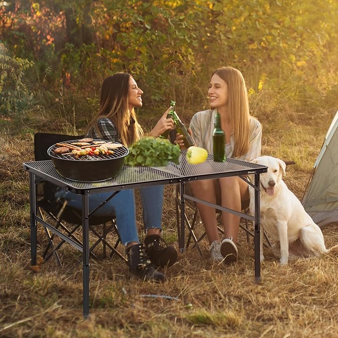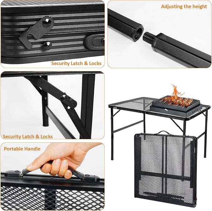 - [Adjustable Grill Table]The folding camping table allows you to adjust the height of the camping table from an initial height of 16.5 inches to a height of 22 inches,providing a perfect surface for you to picnic on the grass or grill standing up