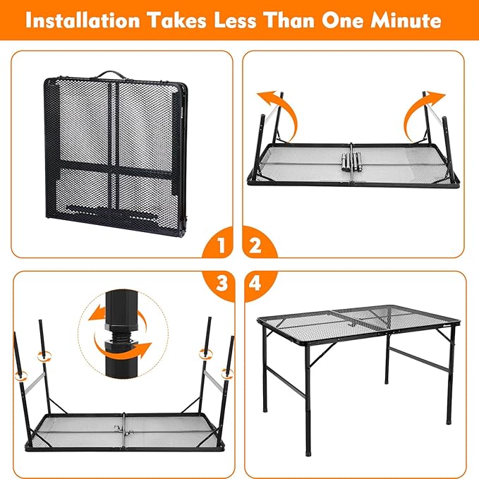 - [Robust and Sturdy] The folding table is made of high-quality aluminum alloy, ensuring its sturdiness and durability. The table top is designed with a metal mesh surface and has been treated with a thickened paint coating, allowing it to withstand prolonged exposure to high temperatures. When stored in the garden, it is resistant to rain and snow, as the limited contact area with the table surface minimizes the risk of staining and rusting