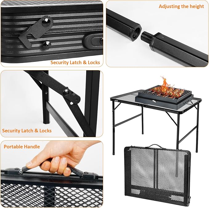 - [Adjustable Grill Table]The folding camping table allows you to adjust the height of the camping table from an initial height of 16.5 inches to a height of 22 inches,providing a perfect surface for you to picnic on the grass or grill standing up