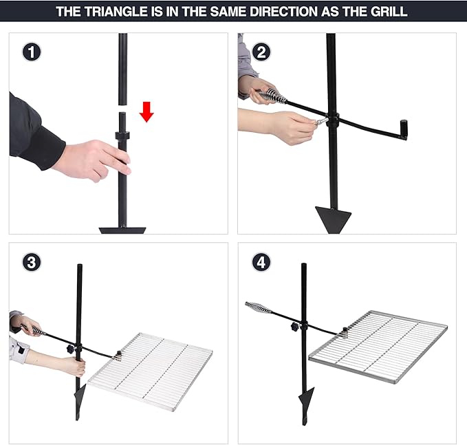 - Adjustable Height: The pole of the barbecue campfire grill consists of 3 steel poles. The height can be adjusted freely, you can adjust to your favorite height. When grilling, please insert the steel base rod into the soil, the triangle is in the same direction as the grill.