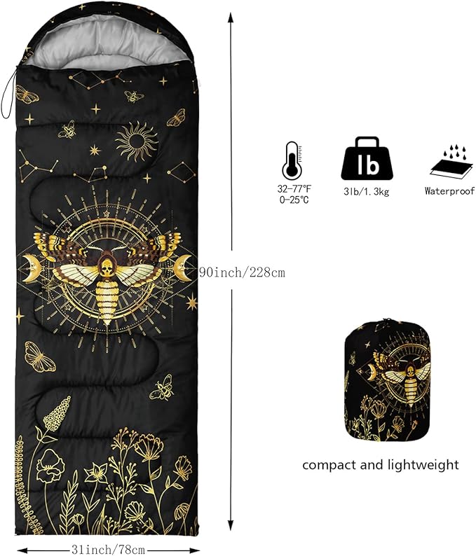 - ๐ใFashion DesignใSIZE - 31 by 90 inches (W x D). Our sleeping bag can be used in 3 seasons with a design temperature of 32โ-77โ(0โ-25โ). These bags also have a weather resistant waterproof design to keep you warm and prevent you from any dampness.