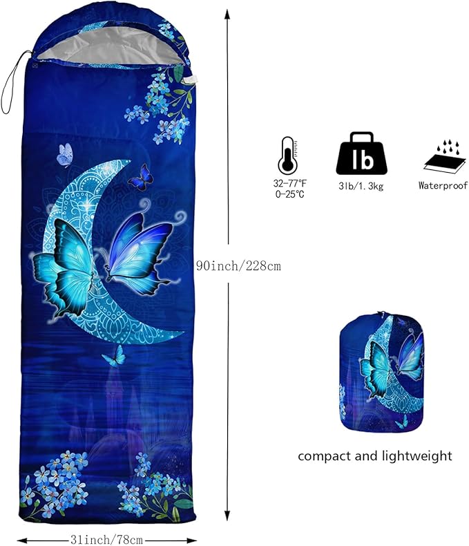 - ๐ใFashion DesignใSIZE - 31 by 90 inches (W x D). Our sleeping bag can be used in 3 seasons with a design temperature of 32โ-77โ(0โ-25โ). These bags also have a weather resistant waterproof design to keep you warm and prevent you from any dampness.