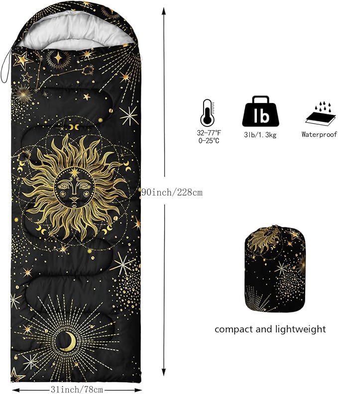 - ๐ใFashion DesignใSIZE - 31 by 90 inches (W x D). Our sleeping bag can be used in 3 seasons with a design temperature of 32โ-77โ(0โ-25โ). These bags also have a weather resistant waterproof design to keep you warm and prevent you from any dampness.