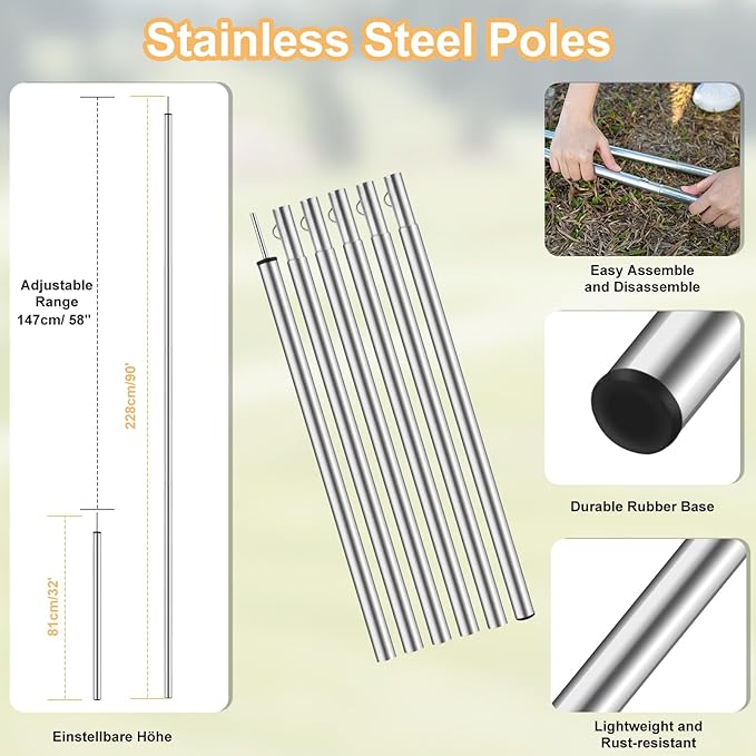 - [Height-Adjustable Poles] PAHTTO camping tarp kit includes 2 adjustable poles, of which the height can be adjusted from 17” to 90” to satisfy your different needs. Customize your shade structure by adjusting the pole height and placement, creating the perfect shelter for your needs.