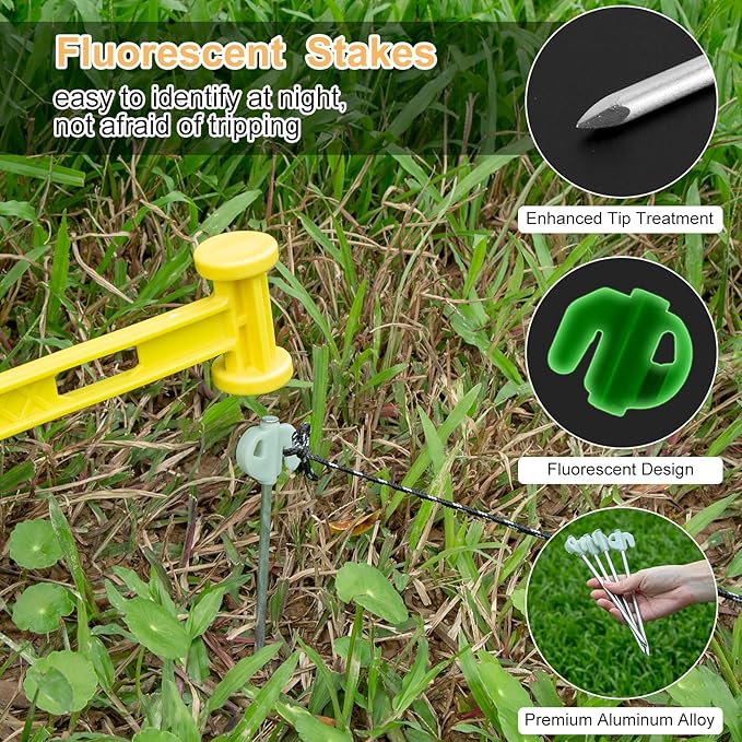 - [Bonus Fluorescent Stakes and Hammer] Our package includes 8 heavy-duty fluorescent stakes that can withstand tough conditions and remain visible in the dark. We also provide a hammer and 8 guylines, ensuring that you have all the necessary tools for quick and easy tarp setup. This kit offers exceptional value for your investment!