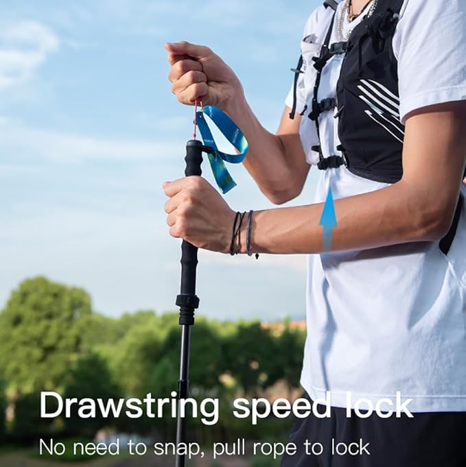 - 【Quick-Lock Technology】Collapsible hiking poles use quick-lock technology, you can easily adjust it and lock them in place takes only a few seconds. The sturdy locks are designed to firmly keep the walking poles in place and prevent them from sliding down, offering you the ultimate stability.