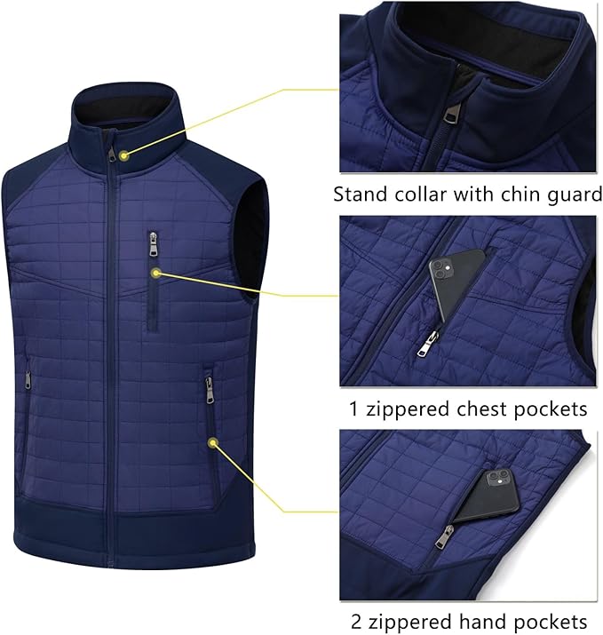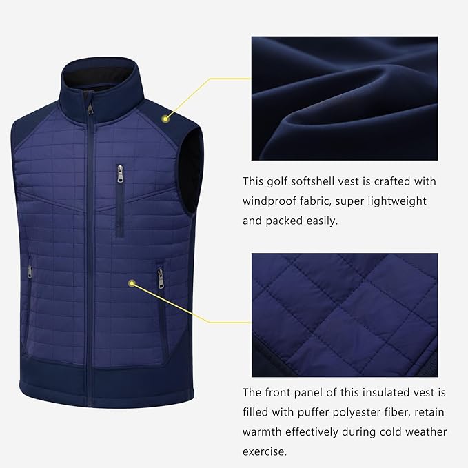 • WINDPROOF & LIGHTWEIGHT: This golf softshell vest is crafted with windproof fabric, super lightweight and packed easily, the front panel of this insulated vest is filled with puffer polyester fiber, retain warmth effectively close to duck down insulation, soft fleece inner lining provides warmth without bulk