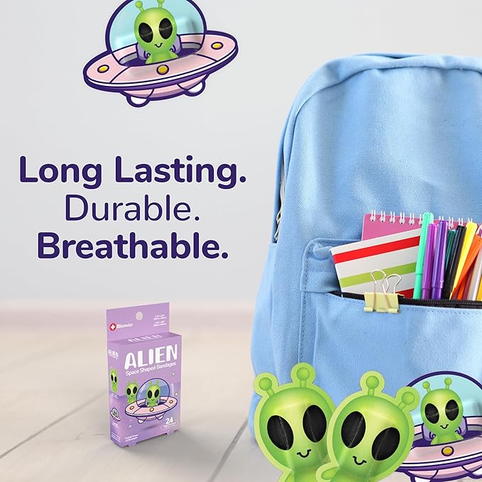 - ALIEN HALLOWEEN BANDAGES: This 24 piece pack of frightfully fun Halloween Alien bandages is great for putting a smile on kids' faces while protecting wounds such as cuts, scrapes, and burns, and come in 2 assorted styles; sticky bandages are perfect for kids and adults alike, and also for school nurses and pediatric doctors