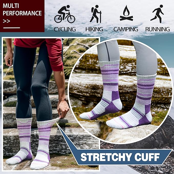 - Protection for Feet:These womens wool hiking crew socks have stretchy cuff and arch support ,which can improve the blood circulation and keep socks fit snugly.Cushion foot absorbs shock and reduces risk of blister.All of these provide more protection for women’s feet.