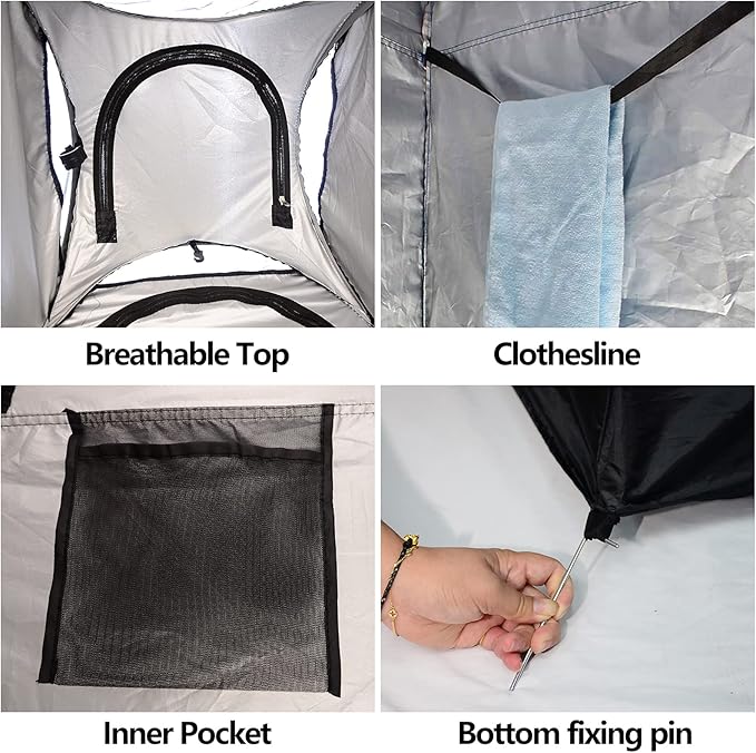 - [Ventilation & Convenient] Mesh roof,one top window and one back window increase ventilation. 1 inside pocket,2 rope, 1 outside pocket,1 lantern hooks and 1 shower hooks to keep your toilet paper,lantern,clothes,towel and shower head.We always focus on our customers' benefit