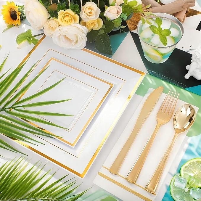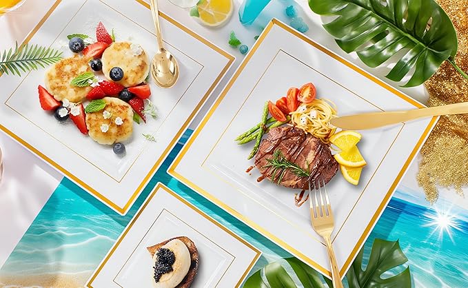 - GOLDEN EDGE DESIGN:Our 50 Serving gold plastic plates feature an eye-catching gold rimmed design that adds a sense of luxury and sophistication to your special occasions, and these gold square plastic plates make your table shine.