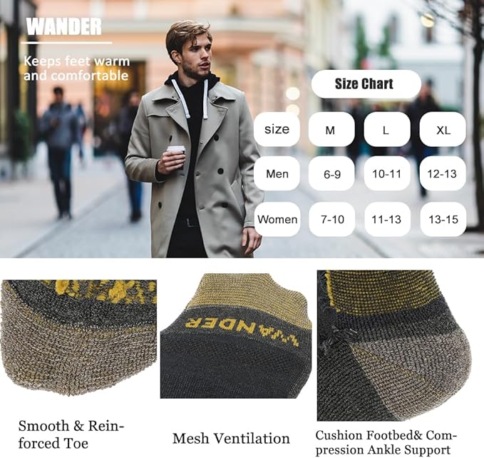 • 【Lightweight Style】60% merino wool, high-density knit makes merino wool socks warm and wicking sweat while being lighter, no bulky, take up less storage, provide max comfort