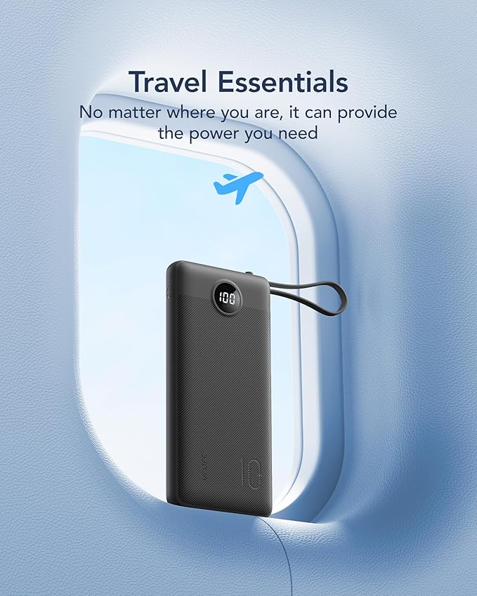 VRURC Portable Charger with Built in Cables, Slim Power Bank 10000mAh, USB C Battery Pack Travel Essential, 5 Outputs 2 Inputs Phone Charging Bank for iPhone 16 15 14 13,Samsung,Android-Black(1 Pack)