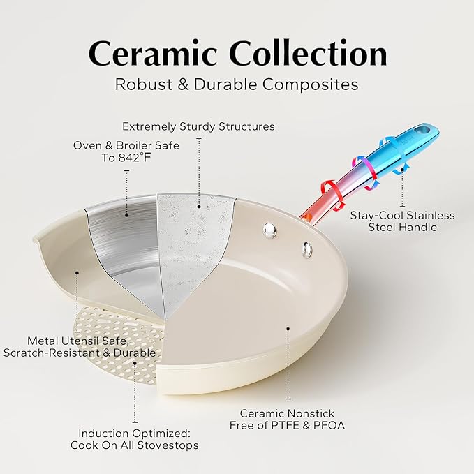 - COOL & STURDY HANDLE: Crafted from lightweight, precision-pressed stainless steel, this ergonomically designed handle ensures a comfortable grip. Double-riveted for exceptional strength and maneuverability, ceramic saute pan empowers you to seamlessly transition from stovetop to oven, allowing you to achieve that flawless sear, brown toppings, or even bake