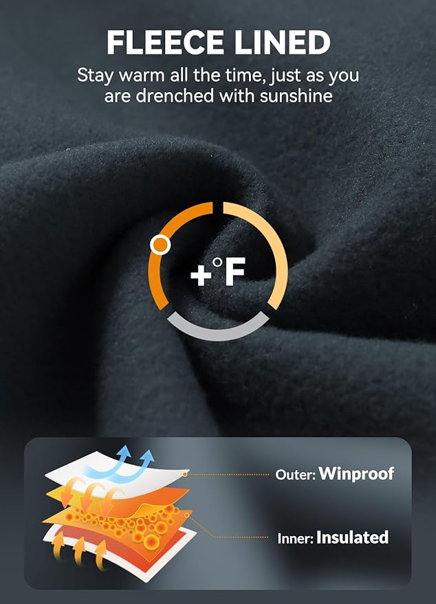 - Warm & Water Resistant:Soft fleece inner layer traps heat to keep you warm & comfortable, perfect for cold days under 40°F. Water resistant fabric can handle light rain for a short time or keep dry in snow days and provide wind protection.