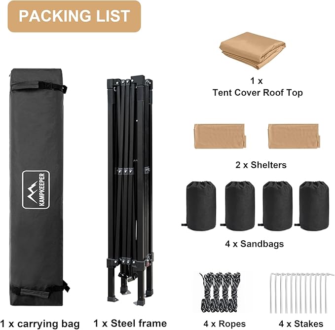 KAMPKEEPER 10x10 Pop Up Canopy Tent with 2 Sidewalls, Beach Tent - Easy Outdoor Sun Shade for Events, Parties, Camping - Gazebo with 4 Weight Bags & Carry Bag.(Khaki)