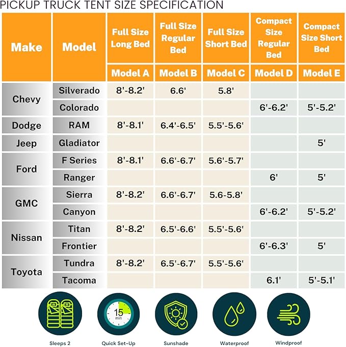 - *[Truck Compatibility]: 5 size Options fit Full Size Truck Short bed, Regular Bed and Long Bed; Compact Size Truck Regular Bed and Short Bed; Spacious interior comfortably sleeps 2 adults; Compatible with Chevrolet Silverado/Colorado, Dodge Ram, Ford F Series/Ranger, GMC Sierra/Canyon, Nissan Titan/Frontier, Toyota Tundra/Tacoma ect