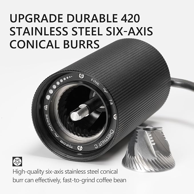 - 【Durable & Efficient】Hight-quality CNC Conical Burr coffee grinder with internal Adjustable Setting ensures precise and uniform grinding for a flavorful pour-over, mocha, espresso coffee