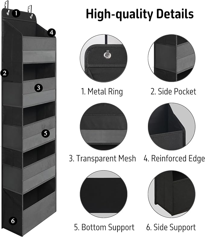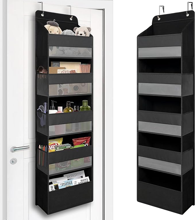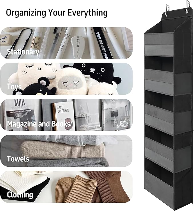 - EFFORTLESS INSTALLATION - No need for tools or hardware; simply utilize the adjustable metal hook to hang the organizer over most doors. Enjoy a hassle-free installation process that takes the stress out of organizing your space.