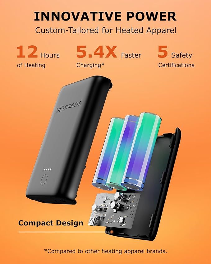 • 2 HRS Fast-Charging Battery Pack: Venustas heated vest comes with a 35W fast charging power bank that can be fully charged in 2h. The multifuntional power bank can not only be used for Venustas 7.4V and 12V heated apparel but also charge your phone or other smart devices, making it convenient in outdoor lifestyle.