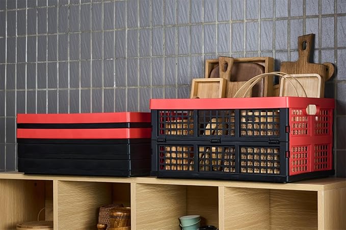 3-Pack Plastic Collapsible Storage Crates-30L,Foldable Plastic Crates for Storage (Black+Red)