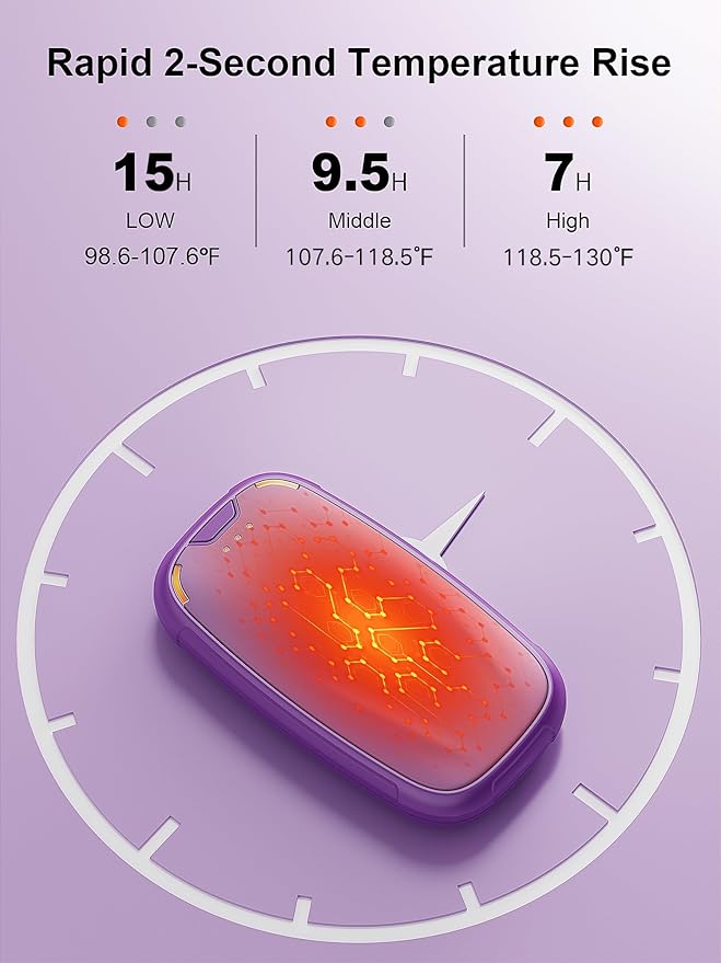 - 【Rechargeable & Three Levels of Temperature】Electric hand warmers, 5200mah rechargable hand warms with up to 12 hours battery life, USB hand warmer. With 3-speed indicator light, you can adjust three different temperatures, the use of time is 7-9.5-12 hours. Choose the right temperature for a comfortable using experience.