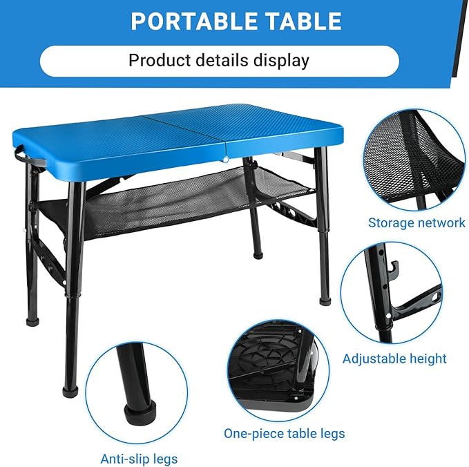 Portable Folding Table and Stool Set, Lightweight Foldable Table & Collapsible Stool for Camping Picnic Beach Fishing, Sturdy Small Outdoor Table with Mesh Layer Storage- Blue