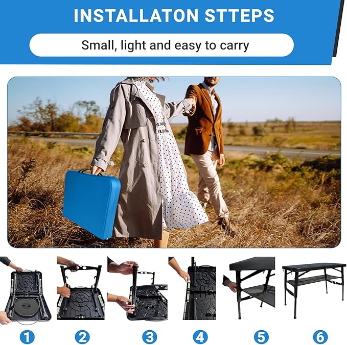 - 👍【UNIQUE DESIGN & LIGHTWEIGHT】 The one-piece portable folding table and collapsible stool is designed a pair of handle for carrying easily, like a briefcase. The total weight is only 6.6lbs, and the folding table and stool weigh 4.4lbs and 2.2lbs respectively. Even more interesting, the stool is hidden in the camping table, when you open the table, can easily take the collapsible stool out.