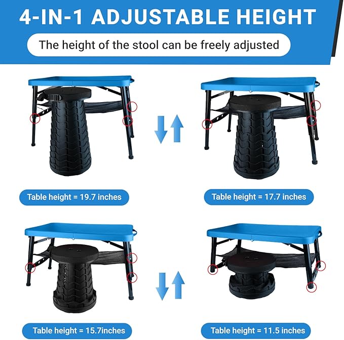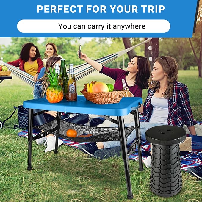 - 👍【ADJUSTABLE HEIGHTS】Our foldable table and collapsible stool can be adjusted to different heights. You can adjust 4 heights easily by height fixator in table legs (11.5 inch; 15.7inch; 17.7inch; 19.7inch). The foldable stool can be adjusted 12 positions from 2.5 inch to 17.8 inch. Perfect for children and adults.
