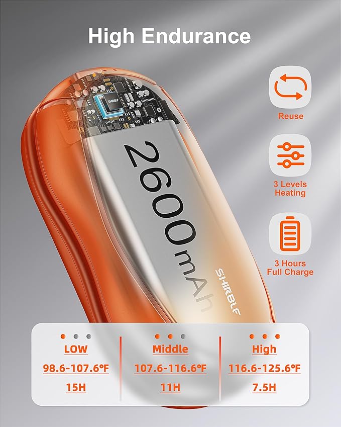 - 【Rechargeable & Three Levels of Temperature】Electric hand warmers, 5200mah rechargable hand warms with up to 12 hours battery life, USB hand warmer. With 3-speed indicator light, you can adjust three different temperatures, the use of time is 7-9.5-12 hours. Choose the right temperature for a comfortable using experience.