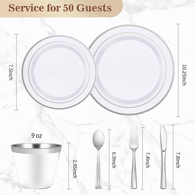 - WHAT YOU GET - Our 300-piece disposable dinnerware set is tailor-made for your 50-guest party. You will receive a comprehensive package featuring 50 dinner plates 10.25'', 50 salad plates 7.25'', 50 cups 9 OZ, 50 knives, 50 forks & 50 spoons.