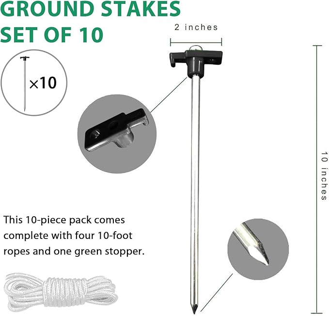 - Comprehensive Set:This 10-piece pack includes four 10-foot ropes and one white stopper, providing everything you need to secure your tent or outdoor shelter.