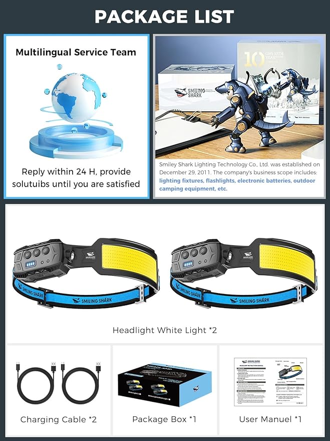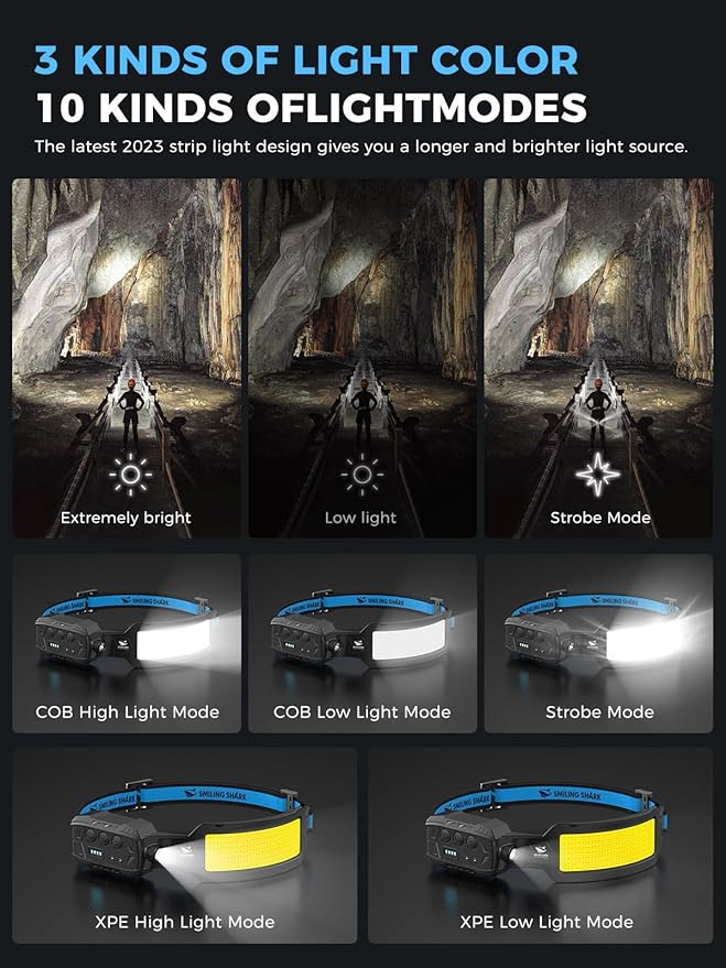 Smiling Shark Headlamp, 2 Pack Head Lamps Led Rechargeable 6 Modes 7*White Lights 270° Lighting Width Motion Sensor Red Tail Light for Camping Fishing Repairation, LED-Headlamp-Rechargeable-Light