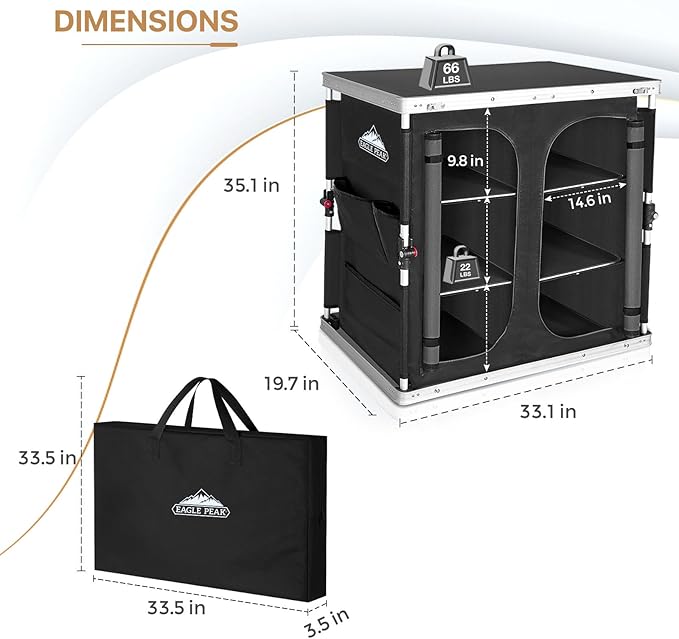 - BREATHABLE & EASY TO CLEAN: EAGLE PEAK portable camping table’s waterproof desktop and the 3 level shelves can be conveniently removed to clean when dirty. 4 mesh backside windows provide breathable airflow. NOTE:the table should not be used in the rain.