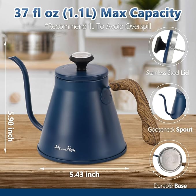 Harriet Gooseneck Kettle with Thermometer for Pour Over Coffee and Tea, 37 fl oz, Stainless Steel, Durable 3-Layer Base, Ideal Spout for Precision Pouring, Compatible with all Stove Tops, Blue