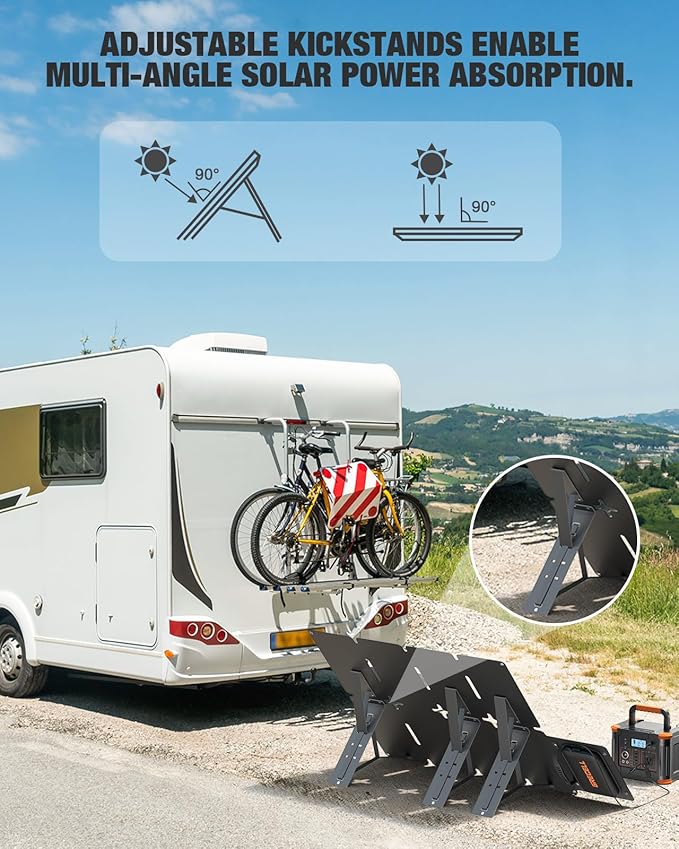 - DURABLE KICKSTAND & EASY TO USE - Using the removable kickstands instead of laying the panel flat on the ground allows it to absorb 25% more sunlight. Unfold all the solar panels in outdoor sunlight, then connect your devices to the output ports, and get power in seconds. Note: this solar charger can't store electricity.