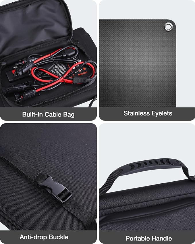 - PERFECT CHOICE FOR OUTDOORS - Compact solar panel charger can be 8 folded down to the size of a small handbag with a handle and built-in zipper accessory pouch, can be easily squeezed into your any backpack, offering portability and simplicity. Equipped with metal hanging holes, you can easily hang it on your tent, RV, backpack or a tree to get solar energy while RV camping, on off-grid trips, hiking, climbing, etc.
