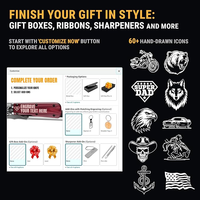 - Perfect Father's Day Gift: From Father's Day deals to unique Father's Day gifts, this folding knife is a versatile and appreciated choice. Make Father's Day truly special with our customizable options, perfect for dad, grandpa, stepdad, or uncle. This gift is also suitable for Father's Day from a sister, wife, or girlfriend.