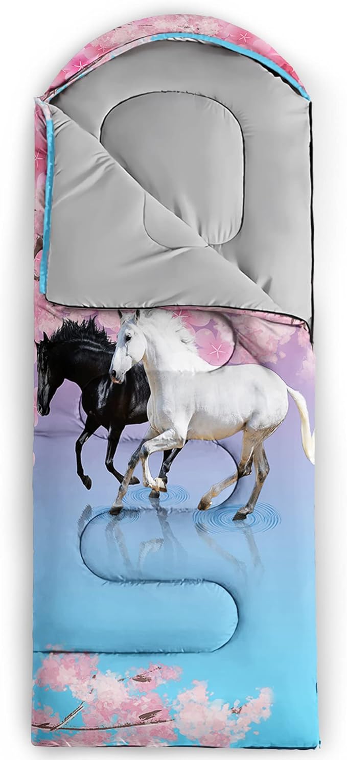 - 【Fits For 3 Seasons】: Size - 31 by 90 inches (W x D). Our Pink cherry blossoms sleeping bag can be used in 3 seasons with a design temperature of 32℉-77℉(0℃-25℃). These 3D Horse bags also have a weather resistant waterproof design to keep you warm and prevent you from any dampness.
