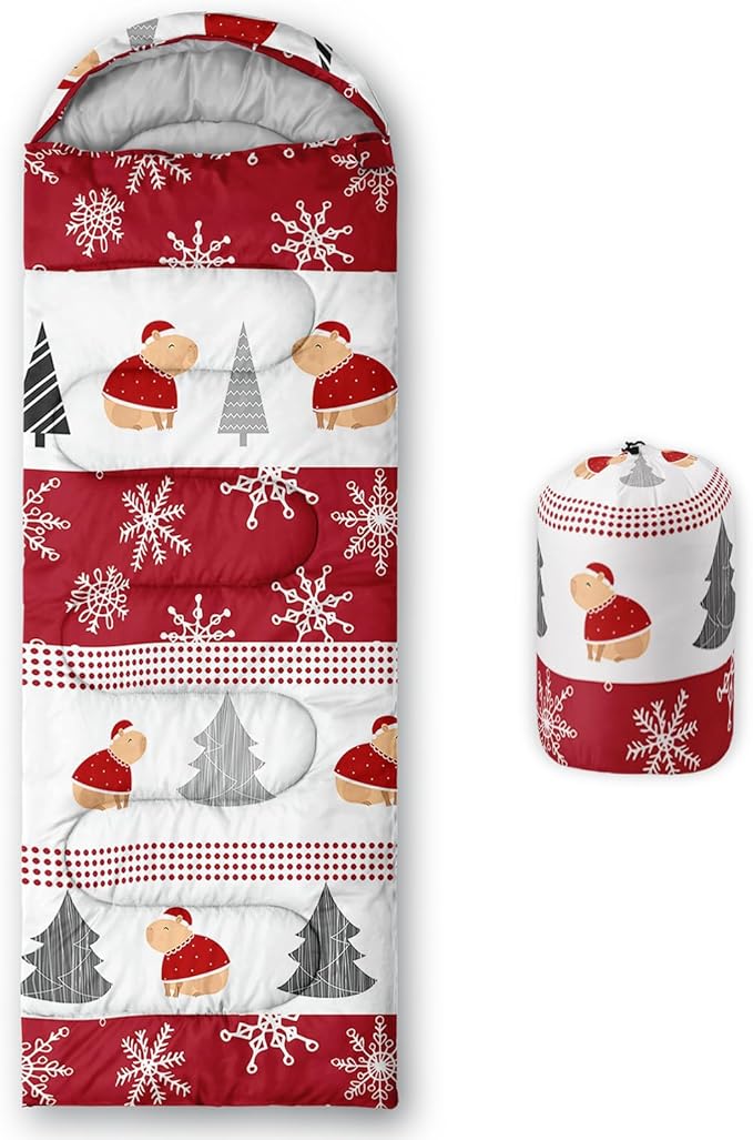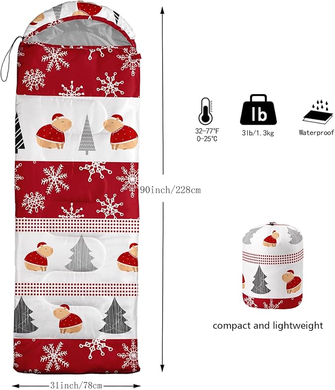 - 【Fits For 3 Seasons】: Size - 31 by 90 inches (W x D). Our Christmas Tree with Snowflakes sleeping bag can be used in 3 seasons with a design temperature of 32℉-77℉(0℃-25℃). These Christmas Capybara bags also have a weather resistant waterproof design to keep you warm and prevent you from any dampness.
