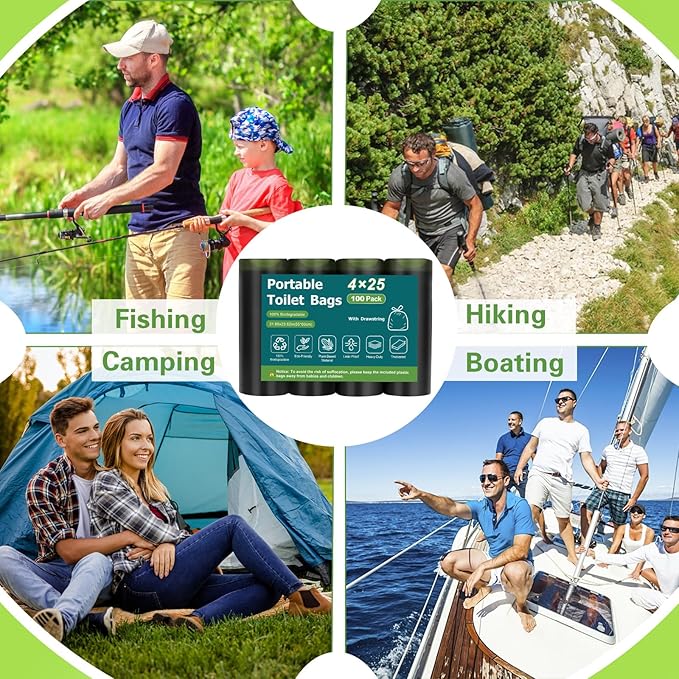 - Universal Use: Our portable toilet bags work with most portable toilets, whether bucket toilet or the seat on a frame style, like camping toilet, portable potty, compost toilet, boat toilet etc; The trash bags are widely used in camping, hiking, boating, fishing, van life and more.