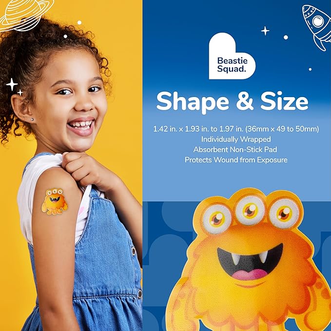 - BEASTIE SQUAD BANDAGES: This 50 piece pack of Beastie Squad bandages feature fun Loki the Cyclops, Mai the Three Eyed Monster, Milo the Faun, and Archie the Goblin shapes, and is great for putting a smile on kids' faces while protecting wounds such as cuts, scrapes, and burns; sticky bandages come in a cute plastic container and are perfect for kids and adults alike, and also for school nurses and pediatric doctors