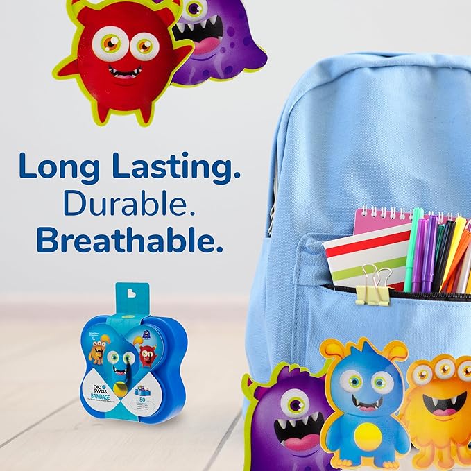 BioSwiss Bandages, Beastie Squad Shaped Self Adhesive Bandage, Latex Free Sterile Wound Care, Fun First Aid Kit Supplies for Kids and Adults, 50 Count