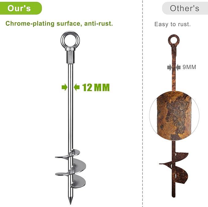 - HIGH QUALITY: Our Trampoline stakes anchors are made with 12mm diameter high quality steel with chorome plate coating, full welded wider spirals, which have stronger hold in soils.
