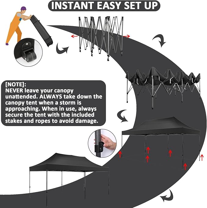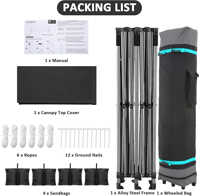 - 【200 SQ Feet Shade Area】COBIZI 10x20 pop up tent provides 200 SQFT spacious covered space, it can easily accommodate 15-20 people, meet your different needs for holding large gatherings. Perfect for wedding, birthday party, market event and other larger events. When in use, always secure the 10x20 pop up tent with the included stakes and ropes to avoid damage. One year after-sale protection for canopy frame; Six months after-sale protection for fabrics and accessories.