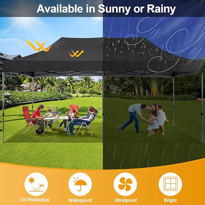 - 【3 Height Settings】10x20 pop up party tent straight leg has 3 height settings. Thumb latch lock system easy to lock and release, raise the pop up tent to a desired height. Canopy tent 10x20 straight leg height options: 220cm/86.6inch, 230cm/90.6inch, 240cm/94.5inch. Corresponding party tent center height options: 310cm/122.0inch, 320cm/126.0inch, 330cm/129.9inch. 10x20 canopy perfect for commercial activities, camping, festivals, tailgating, backyard events and etc..