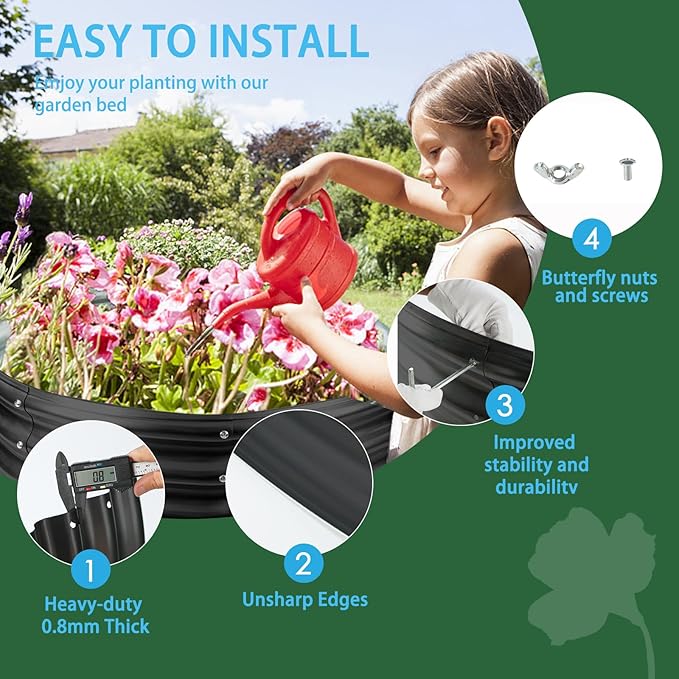 - 【EASY ASSEMBLY】: This galvanized steel raised garden bed only takes about 5 minutes to assemble easily,a screwdriver and a pair of gloves are need,which are prepared in the package already