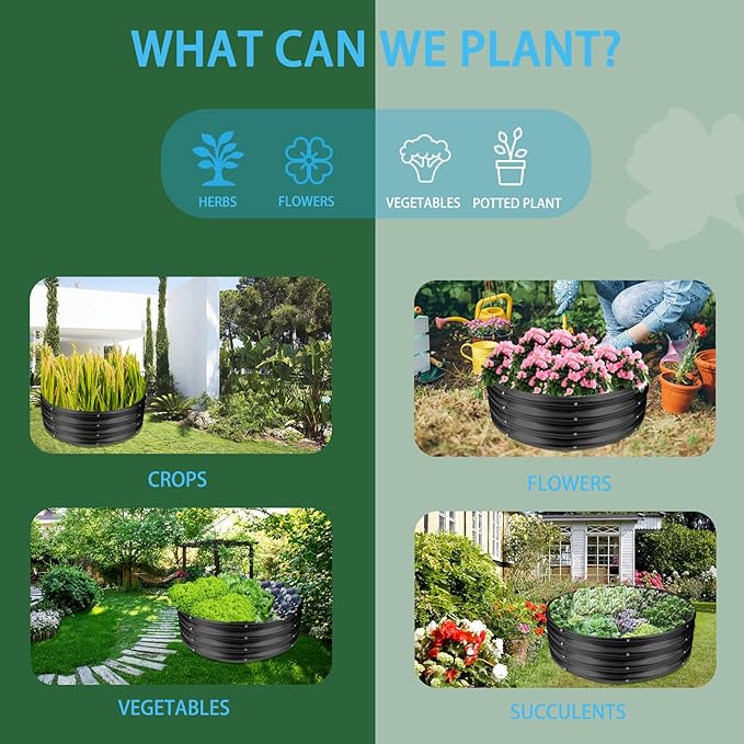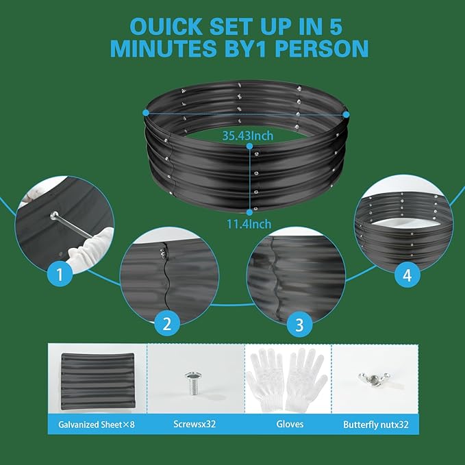- 【STABLE】: This round raised garden bed is 36 IN Diameter,11.8 IN Tall, each is made of 0.8 MM thick Q195 galvanized metal sheet, double-layer anti-corrosion galvanizing and round structure design,it will provide a solid foundation for your plants