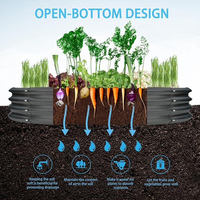 - 【OPEN BOTTOM】: This galvanized raised garden beds have open bottom design,which promotes healthy drainage and allows for deeper root growth, ensuring your plants thrive