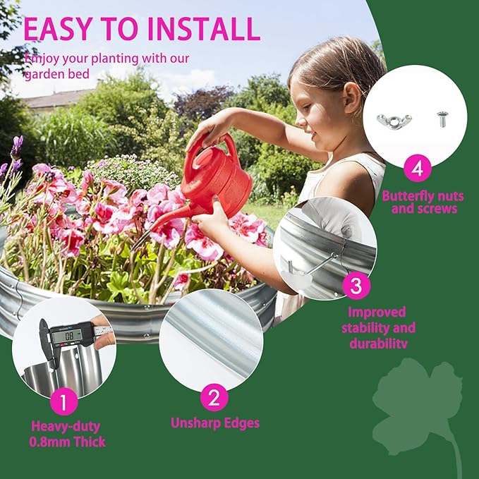 - 【STABLE】: This round raised garden bed is 32 IN Diameter,11.8 IN Tall, each is made of 0.8 MM thick Q195 galvanized metal sheet, double-layer anti-corrosion galvanizing and round structure design,it will provide a solid foundation for your plants